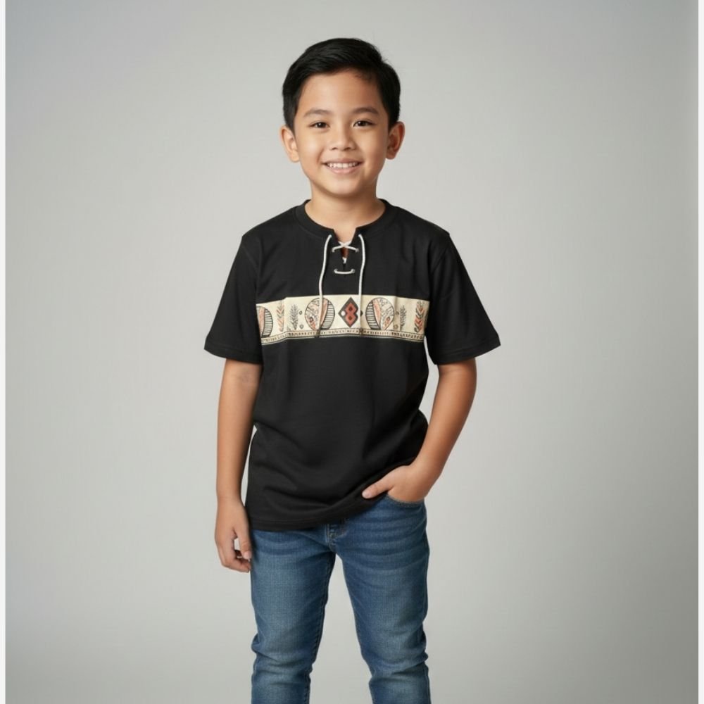 A bold, heritage-inspired graphic tee for boys that blends modern street style with traditional artistry. Featuring unique tribal motifs and a decorative lace-up collar, it’s the perfect statement piece for a standout look