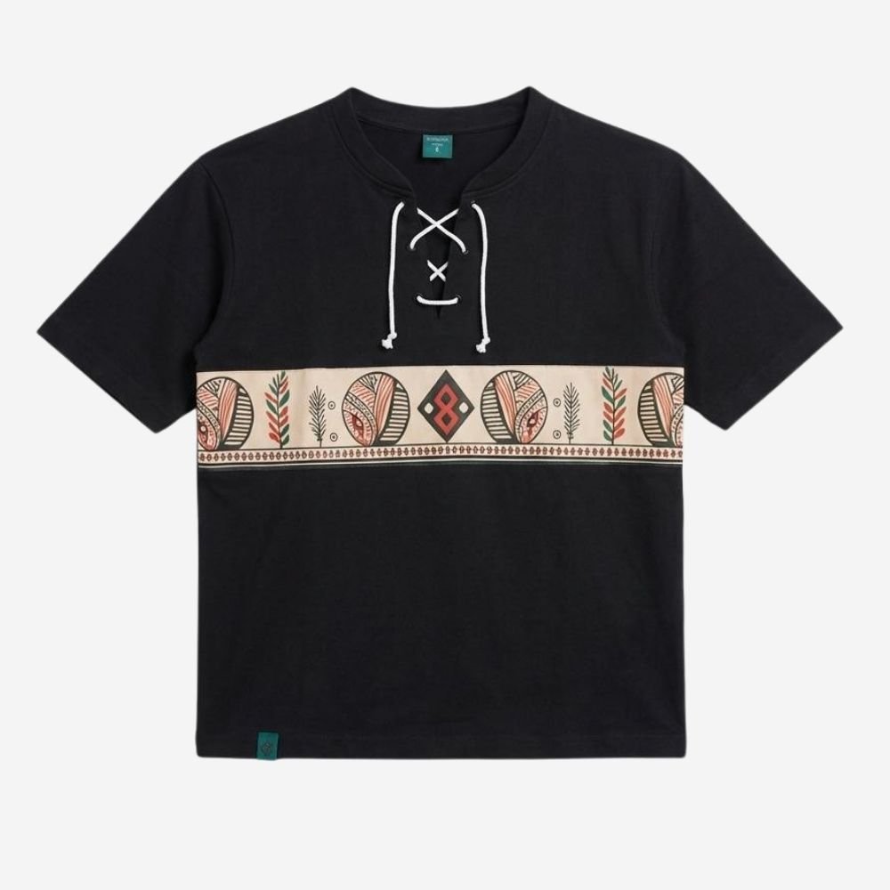 Upgrade his wardrobe with a t-shirt that tells a story. This premium black tee features a striking horizontal band of cultural-inspired illustrations, including geometric shapes and botanical elements. The center-chest “X” embroidery and faux-lace neckline add a unique, artisanal touch that separates this from a standard graphic tee.