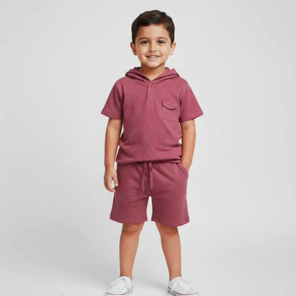 The Ultimate Fusion of Comfort and Utility Elevate his downtime with the “Nomad” set, designed for the little explorer who refuses to sacrifice style for comfort. This set breaks away from the traditional tracksuit, offering a modern short-sleeved hoodie paired with coordinated shorts. The rich, dusty rose hue and textured fabric provide a high-end, boutique feel that transitions effortlessly from a day at the park to a family travel day.
