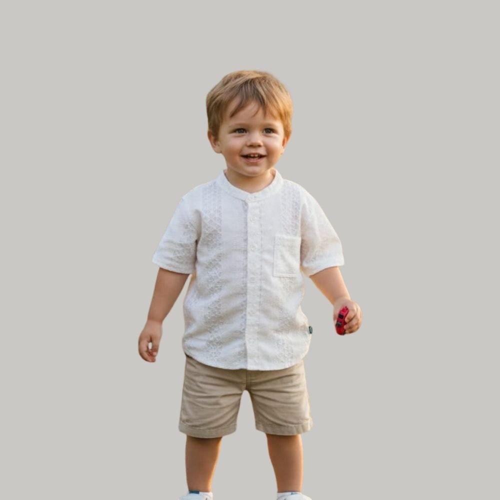 Classic Elegance with a Modern Silhouette Step away from the ordinary with a shirt designed for the littlest gentlemen. This crisp white piece is defined by dual panels of delicate, tonal embroidery that run vertically down the chest, offering a nod to traditional craftsmanship. The collarless mandarin neckline keeps the look modern and breathable, ensuring your toddler looks sharp without feeling restricted.