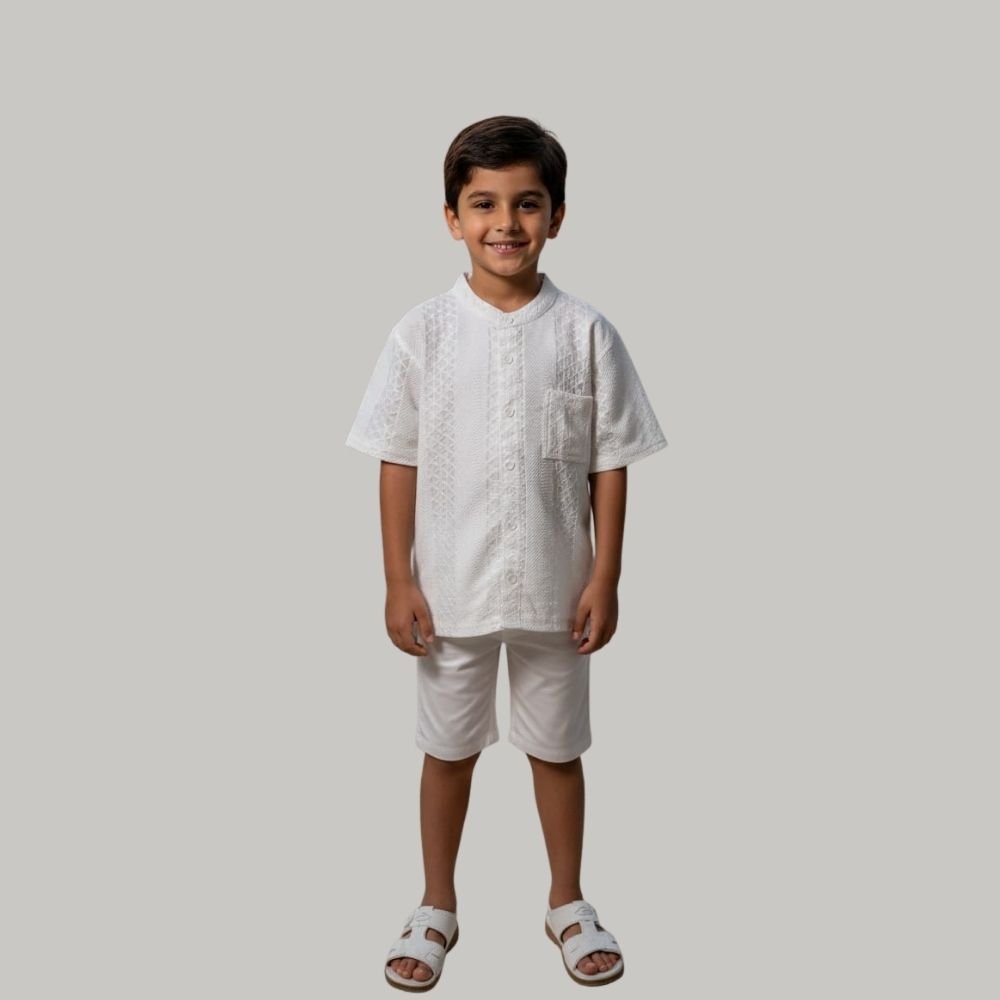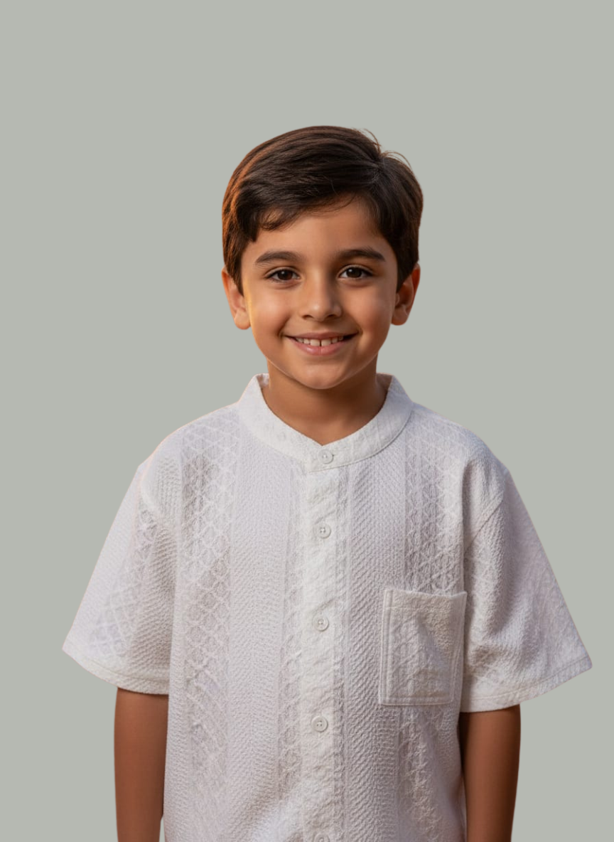 A refined, vintage-inspired button-down featuring intricate geometric embroidery and a clean mandarin collar. Tailored for boys aged 6-14, this 100% cotton shirt offers a timeless, polished look for life’s special milestones.